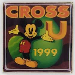 A square pin with Mickey throwing his arms out in the center. "Cross-U" is written across the top, and "1999" across the bottom. Given to employees with an attached thank you card from Lee Cockerell, Executive Vice President of Operations.Cross U is an opportunity for cast members to train in high need areas during peak holiday seasons.