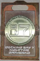Docking Bay 7 Nighttime Gathering is a Limited Release pin from the Star Wars Galaxy's Edge pin series. It was originally released 2025 and was available from Multiple Sources (WDW, DLR, etc.).