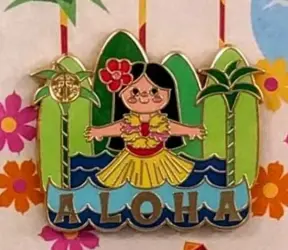 Aloha is a Limited Edition (LE) 100 pin in the A Smile Means Friendship to Everyone Framed Set — Full Set 9-pin set from the it's a small world 50th anniversary pin series. It was originally released on , 2016 and was available from Disneyland Resort .