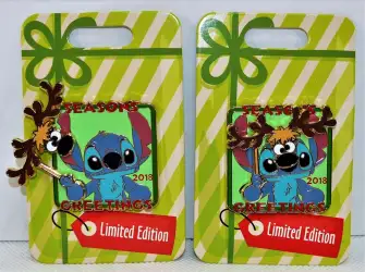 Stitch is a Limited Edition (LE) 5000 pin from the Season's Greetings 2018 pin series. It was originally released on , 2018 and was available from Multiple Sources (WDW, DLR, etc.).