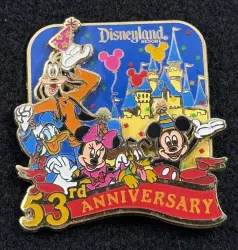 Disneyland 53rd Anniverary is a Limited Edition (LE) 1000 pin from the Disneyland Anniversaries pin series. It was originally released on , 2008 and was available from Disneyland Resort .