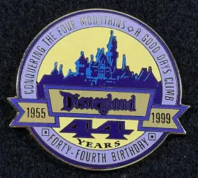 Disneyland 44 Years - Conquering the Four Mountains - Round Logo is a Limited Release pin from the Disneyland Anniversaries pin series. It was originally released in July, 1999 and was available from Disneyland Resort .