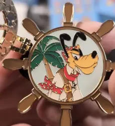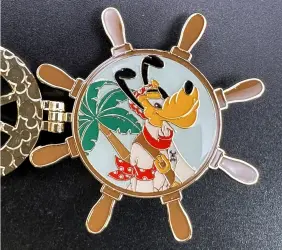 Pluto is an Open Edition pin from the Mickey & Friends - Pirates of the Caribbean Hinged Ship's Wheel Mystery Collection pin series. It was originally released on , 2025 and was available from Shanghai Disney Resort .