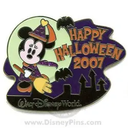 Minnie as a witch is a Limited Edition (LE) 2000 pin from the Happy Halloween 2007 - Cute Characters pin series. It was originally released on , 2007 and was available from Walt Disney World .