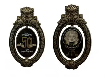 Oval Plaque Spinner Pins — Madame Leota is a Limited Edition (LE) 2000 pin in the Oval Plaque Spinner Pins — Framed Set with Bride & Hatbox Ghost Completers 7-pin set from the The Haunted Mansion 50th Anniversary Event pin series. It was originally released on , 2019 and was available from Disneyland Resort .