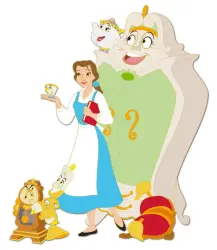 Pin features Belle , Lumiére , Cogsworth , Mrs. Potts and Chip from Beauty and the Beast