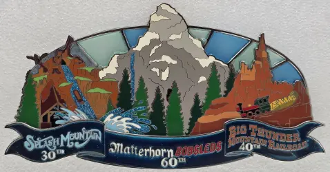 Splash Mountain 30th, Matterhorn Bobsleds 60th, and Thunder Mountain 40th Anniversaries is a Limited Edition (LE) 250 pin from the Attraction Anniversaries pin series. It was originally released on , 2019 and was available from Multiple Sources (WDW, DLR, etc.).