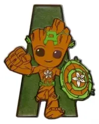 Groot as Captain America - A is an Open Edition pin from the Marvel We Are Groot Mystery Pin Set pin series. It was originally released on , 2025 and was available from Multiple Sources (WDW, DLR, etc.).