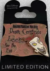 Lock Death Certificate is a Limited Edition (LE) 300 pin from the Haunted Mansion Holiday pin series. It was originally released in November, 2009 and was available from Walt Disney Imagineering .