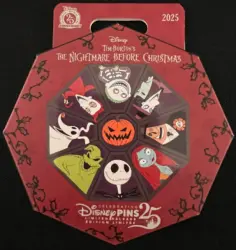 Pin features Jack Skellington , Oogie Boogie , Sally , Zero , Lock, Shock & Barrel and Mayor from The Nightmare Before Christmas