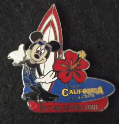 California Adventure Surfboard Mickey Est 2001 is an Open Edition pin. It was originally released on , 2001 and was available from Disneyland Resort .