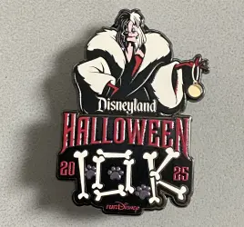 Halloween 10K - Logo - Cruella De Vil is a Limited Release pin from the runDisney: Disneyland Halloween Half Marathon Weekend 2025 pin series. It was originally released on , 2025 and was available from Disneyland Resort .