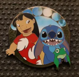 Lilo & Stitch w Frog is a Limited Edition (LE) 75 pin from the Timeless Series by DaVinci Fantasy Pins pin series. It is an Unlicensed (Fantasy) pin, so therefore it is not allowed to be traded in the Disney Parks.