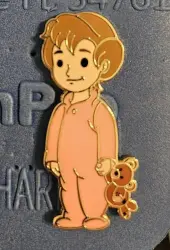 Michael with Teddy Fantasy pin by Mama Whale Pins is a pin from the FSY Mama Whale PIns pin series. It is an Unlicensed (Fantasy) pin, so therefore it is not allowed to be traded in the Disney Parks.