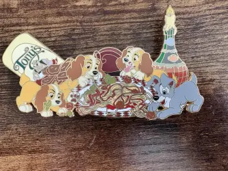 Lady and the Tramp - Precious Feasts is a Limited Edition (LE) 50 pin from the Flights o' Fancy pin series. It is an Unlicensed (Fantasy) pin, so therefore it is not allowed to be traded in the Disney Parks.
