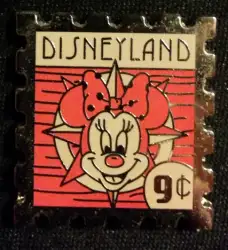 Disneyland Minnie 9¢ stamp is an Open Edition pin from the 2008 Hotel Hidden Mickey - Stamps pin series. It was originally released in June, 2008 and was available from Disneyland Resort .