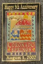Happy 5th Anniversary is a Limited Edition (LE) 800 pin from the Disney's Coronado Springs Resort Anniversaries pin series. It was originally released on , 2002 and was available from Walt Disney World .