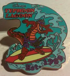 Typhoon Lagoon Est. 1989 - Lagoon Gator Surfing is an Open Edition pin from the Typhoon Lagoon pin series. It was originally released in June, 2002 and was available from Walt Disney World .