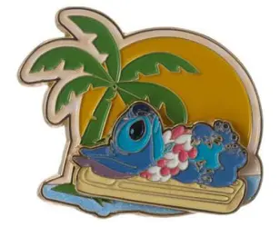 Stitch on a Float is an Open Edition pin from the Miniso - Stitch Hawaii Metal Badge Collection pin series. It was originally released 2025 and was available from an Officially Licensed Disney trading pin vendor (see description for more information).