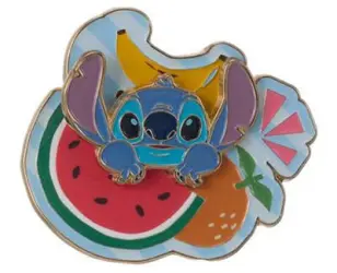 Stitch w/ Watermelon is an Open Edition pin from the Miniso - Stitch Hawaii Metal Badge Collection pin series. It was available from an Officially Licensed Disney trading pin vendor (see description for more information).