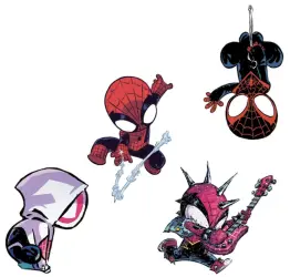Skottie Young - Spider-Verse Pin Set is a Limited Release 0-pin set from the NYCC 2025 - Marvel pin series. It was originally released on , 2025 and was available from an Officially Licensed Disney trading pin vendor (see description for more information).