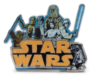 Pin features Luke Skywalker , Han Solo , Princess Leia , Chewbacca , C-3PO , R2-D2 and Ewoks