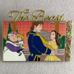 Pin features Belle , Mrs. Potts , Chip and Prince Adam from Beauty and the Beast