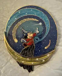 Sorcerer Mickey is a Limited Edition (LE) 75 pin from the Fantasy pin series. It is an Unlicensed (Fantasy) pin, so therefore it is not allowed to be traded in the Disney Parks.