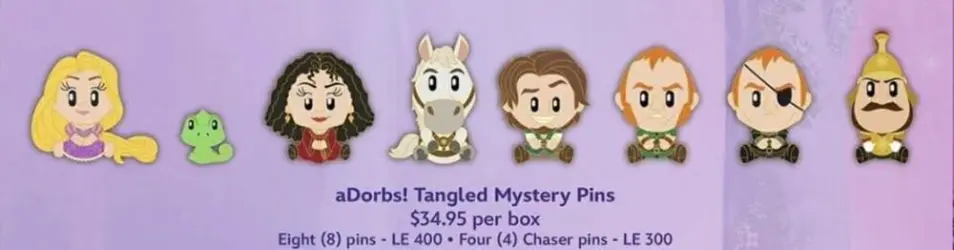 aDorbs! Tangled Mystery Pins (Unopened Box) is a Limited Edition (LE) 400 pin from the Rapunzel aDorbs! Mystery Pin Series pin series. It was originally released on , 2025 and was available from Walt Disney Imagineering .