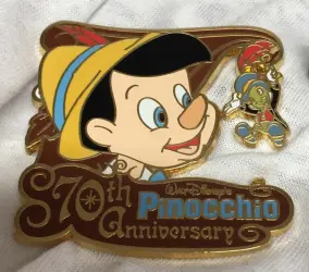 Pinocchio 70th Anniversary is a Limited Edition (LE) 1500 pin from the Pinocchio Anniversaries pin series. It was originally released on , 2010 and was available from Multiple Sources (WDW, DLR, etc.).