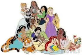 Pin features Snow White , Ariel , Flounder , Jasmine , Lucifer , Pascal , Rajah , Rapunzel , Cinderella , Mulan , Hei Hei , Moana , Pua , Meeko , Pocahontas , Ray and Little Brother from Tangled , Mulan (movie) , Cinderella (movie) , The Princess and the Frog , The Little Mermaid , Moana (movie) , Aladdin (movie) , Snow White & the Seven Dwarfs and Pocahontas (movie)