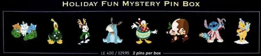 Holiday Fun Mystery Pins (Unopened Box) is a Limited Edition (LE) 400 pin from the A Jolly Holiday on the Lot - Holiday Fun Mystery Pins pin series. It was originally released on , 2025 and was available from Disney Employee Center .