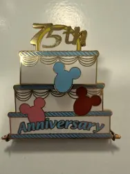 Mickey 75th Anniversary Cake slider and hinge is a Limited Edition (LE) 1500 pin from the Mickey Mouse 75th Anniversary pin series. It was available from Disney Cruise Line .