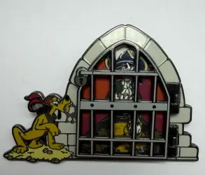 Pluto & Goofy in Jail Cell is a pin from the Pirates of the Caribbean: Battle for the Sunken Treasure pin series. It was available from Shanghai Disney Resort .