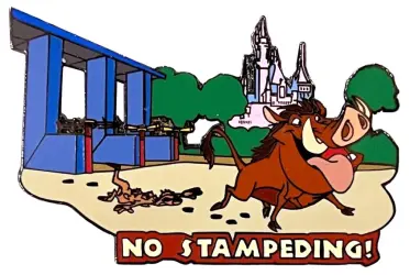 No Stampeding is an Open Edition pin from the Wild About Safety Collection pin series. It was originally released on , 2003 and was available from Multiple Sources (WDW, DLR, etc.).
