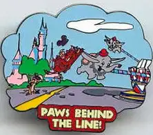 Paws Behind the Line! is an Open Edition pin from the Wild About Safety Collection pin series. It was originally released on , 2003 and was available from Multiple Sources (WDW, DLR, etc.).