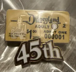 45th ticket is a Limited Edition (LE) 1000 pin from the Disneyland Disney pin series. It was available from Disneyland Resort .