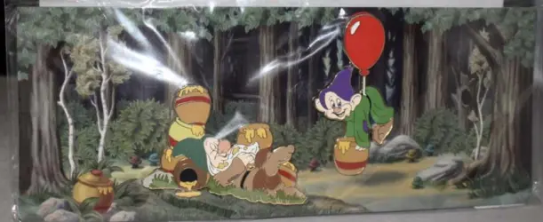 Dopey and Sleepy with Hunny Pots is a Limited Edition (LE) 200 pin from the Seven Dwarfs Fantasyland Construction Fence Disney pin series. It was originally released 2013 and was available from Walt Disney Imagineering .