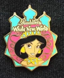 Aladdin's Whole New World - Jasmine is an Open Edition pin from the Tokyo DisneySea Abu's Bazaar Game Prizes pin series. It was originally released on , 2005 and was available from Tokyo Disneyland Resort .