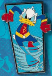 Super Hero Donald is an Open Edition pin in the Super Character Booster Set 6-pin set from the Disney Destiny Maiden Voyage Disney pin series. It was originally released on , 2025 and was available from Disney Cruise Line .