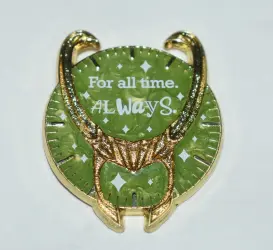 Loki Helmet w/ Quote (Pearl Variant) is an Open Edition pin from the Fantasy Maker: Lunamise pin series. It is an Unlicensed (Fantasy) pin, so therefore it is not allowed to be traded in the Disney Parks.