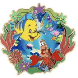 Flounder and Sebastian is an Open Edition pin from the PALM Disney Princesses Sidekicks Once Upon a Royal Realm Mystery Disney pin series. It was originally released on , 2026 and was available from an Officially Licensed Disney trading pin vendor (see description for more information).