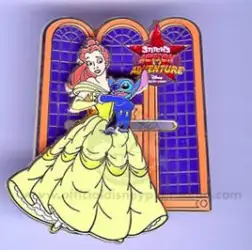Pin features Belle and Stitch from Lilo and Stitch and Beauty and the Beast