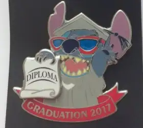 2017 Stitch with diploma is a Limited Edition (LE) 2000 pin from the Graduation pin series. It was originally released on , 2017 and was available from Multiple Sources (WDW, DLR, etc.).