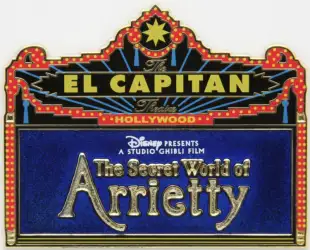 El Capitan Marquee -The Secret World of Arrietty is a Limited Edition (LE) 150 pin from the El Capitan Marquee Series pin series. It was originally released on , 2012 and was available from Disney Studio Store Hollywood / Soda Fountain .