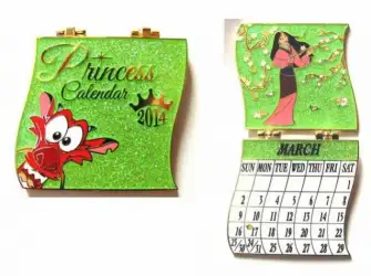 Mulan is a Limited Edition (LE) 400 pin from the Princess Calendar 2014 pin series. It was originally released on , 2014 and was available from Disney Studio Store Hollywood / Soda Fountain .