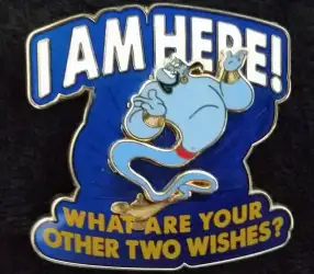 Aladdin - Genie - I Am Here! What Are Your Other Two Wishes? is an Open Edition pin. It was originally released on , 2014 and was available from Multiple Sources (WDW, DLR, etc.).