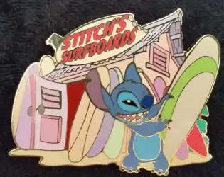 Stitch Surfboard Shop is a Limited Edition (LE) 1000 pin from the Disney Characters as Business Owners pin series. It was originally released on , 2004 and was available from Disney Auctions .