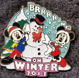 Mickey and Minnie Brrrring on winter 2013 is a Limited Edition (LE) 2000 pin from the Disney Parks Seasons - Winter pin series. It was originally released on , 2013 and was available from Multiple Sources (WDW, DLR, etc.).