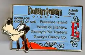 Goofy - E Ticket = Downtown Disney is a Limited Edition (LE) 1500 pin from the Cast Pin Parties - Ticket Book Series pin series. It was originally released on , 2005 and was available from Walt Disney World .
